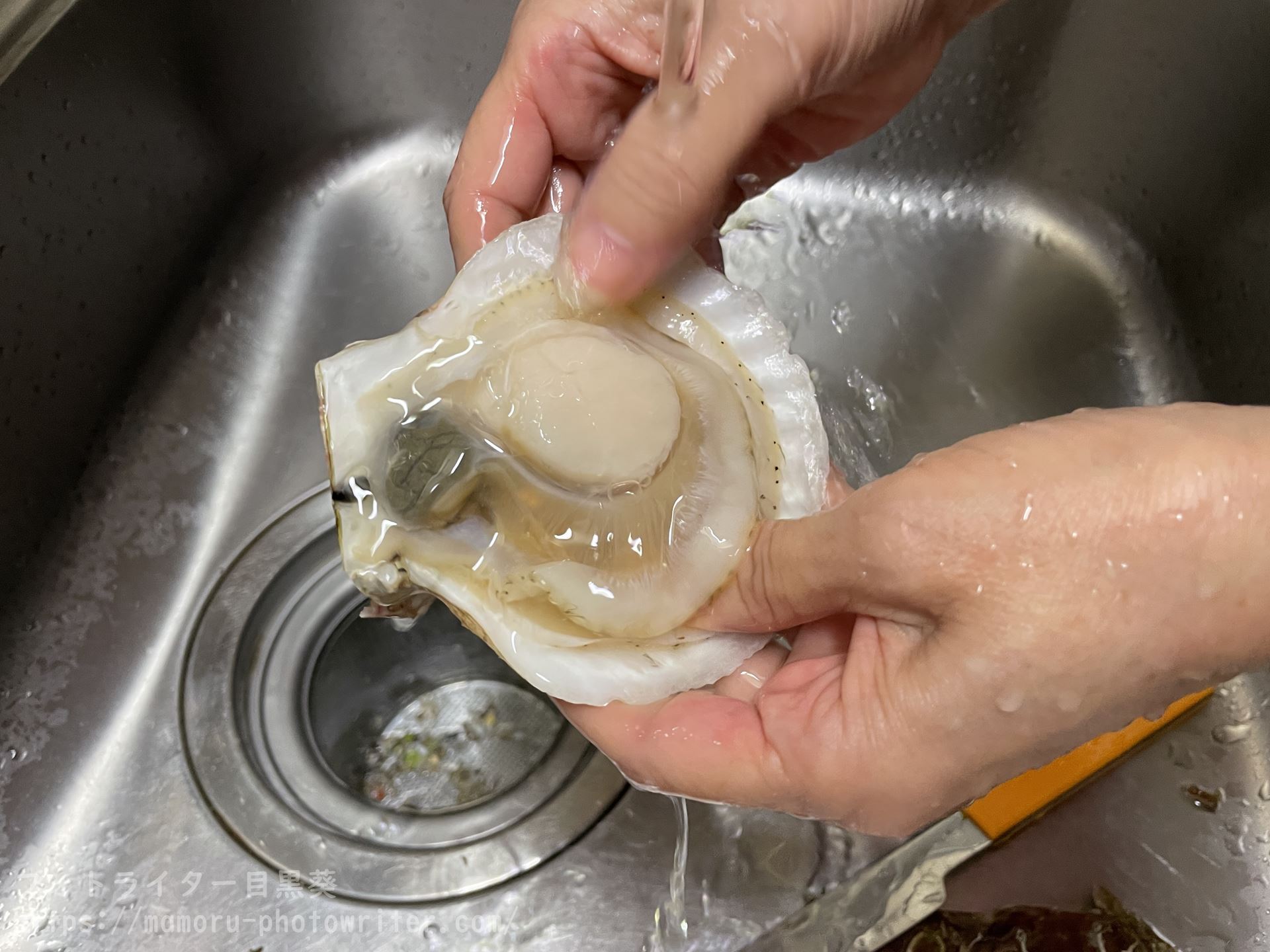 ほたての「ウロ」と呼ばれる黒い部分をむしり取ったら、もう下処理はほぼ完了です。